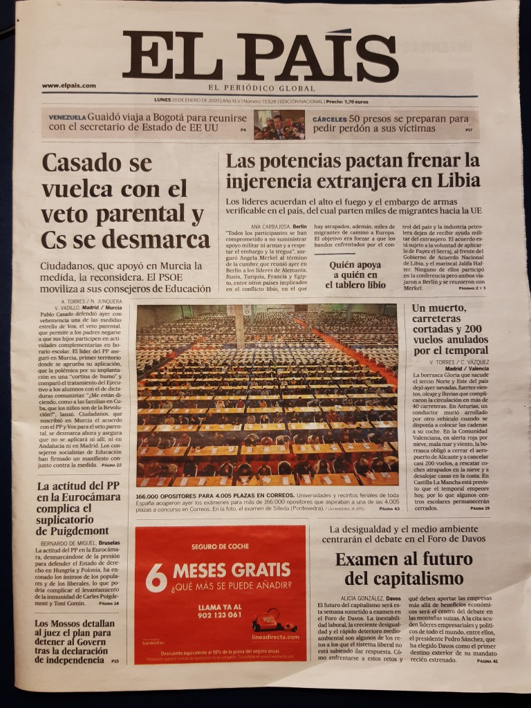 Imagen 1. Fotografía de la portada de la edición en papel de El País el 20 de enero de 2020.