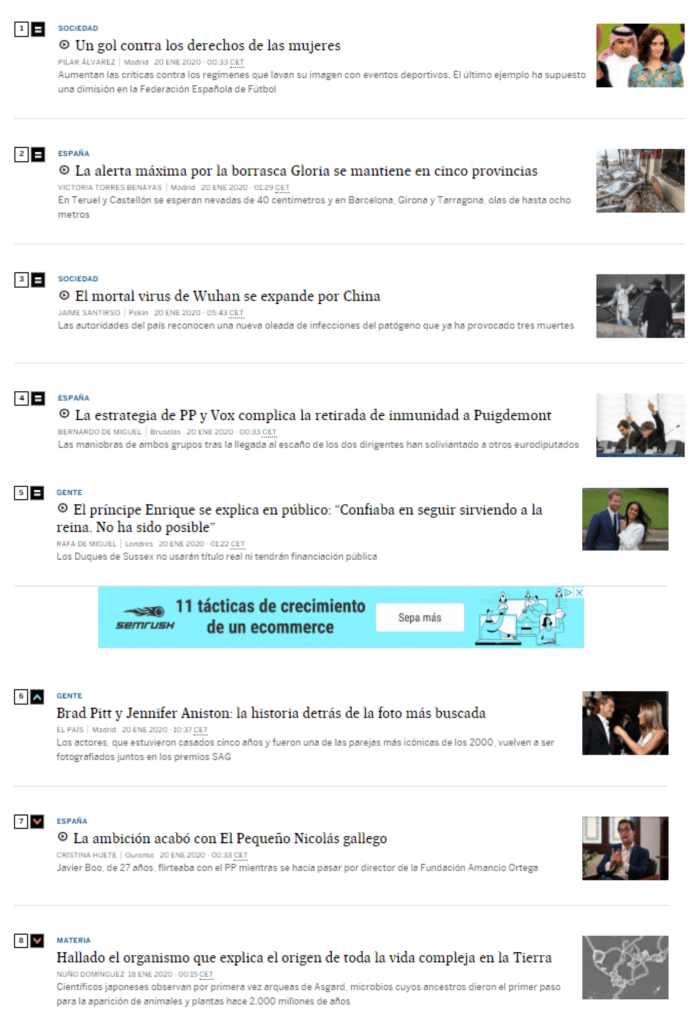 A continuación se muestran los titulares de las noticias más leídas en la edición digital de El País (Imagen 3): “Un gol contra los derechos de las mujeres” (sección Sociedad), “La alerta máxima por la borrasca Gloria se mantiene en cinco provincias” (sección España), “El mortal virus de Wuhan se expande por China” (sección Sociedad), “La estrategia de PP y Vox complica la retirada de inmunidad a Puigdemont” (sección España), “El príncipe Enrique se explica en público: ‘Confiaba en seguir sirviendo a la reina. No ha sido posible’” (sección Gente), “Brad Pitt y Jennifer Aniston: la historia detrás de la foto más buscada” (sección Gente), “La ambición acabó con El Pequeño Nicolás gallego” (sección España) y “Hallado el organismo que explica el origen de toda la vida compleja en la Tierra” (sección Materia).