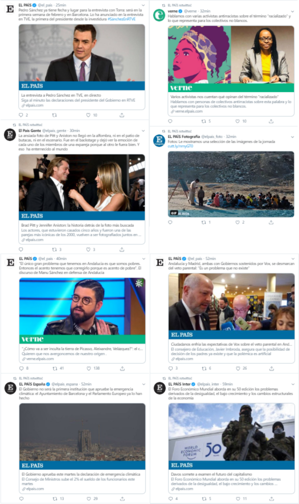 Imagen 4. Captura de pantalla de las ocho noticias compartidas a través de la cuenta oficial de El País (@el_pais) de la red social Twitter.