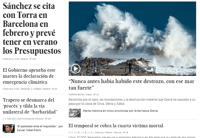 De las ocho noticias más leídas de la edición digital, solamente dos de ellas han sido publicadas en la portada de la edición impresa. Por un lado, la noticia sobre el PP y Puigdemont y, por otro lado, la noticia sobre la borrasca Gloria. Ambas noticias son abordan temas o sucesos de interés general para los lectores españoles (aparecen dentro de la sección titulada España, Imagen 1 y 3).